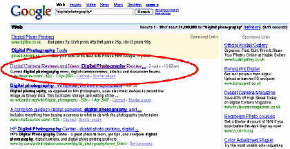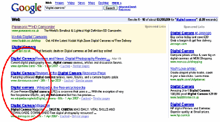 Well, let’s start with an example of a well-written and highly ranked website in a competitive sector – digital cameras. I’ll go to Google and do a search, say for “digital camera”: at the time of writing, here are the results: