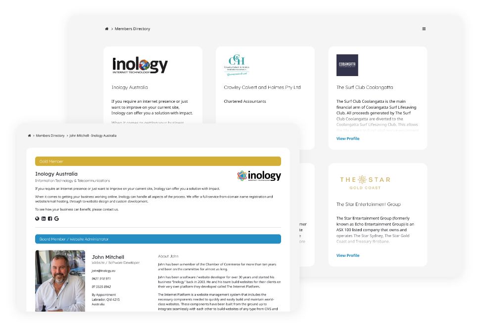 Customise what information is displayed in the directory and member profile views, and enable sorting and filtering by group, industry, and/or region.