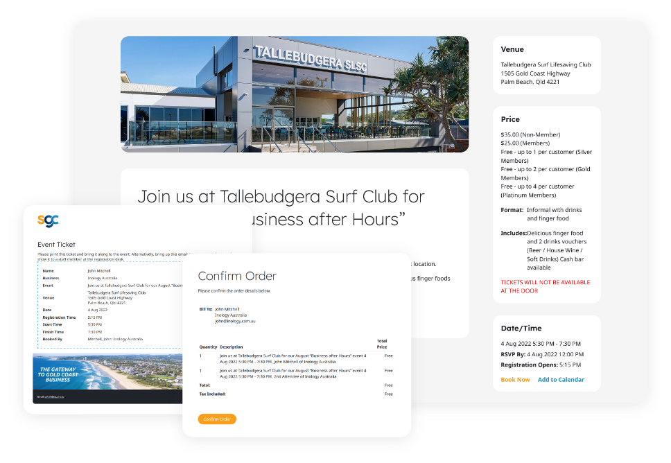 Add events to your website and take bookings online. Apply discounts for different membership levels, group bookings, or a special promotion. Set the maximum number of attendees and the system will automatically manage availability.